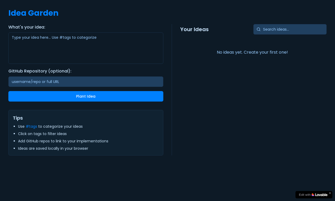 A web app that lets me store ideas before i forget them. one simple textarea element labeled What's your idea: . the interface will have the submit function with the history of submissions convientently floating on the right side of the page, with easy access to the submissions. there will be a tag system, with ideas searchable and viewable by tag. Data properties for each idea should include date submitted (required), idea (required), tags(separated by commas), and github repository. Users can add a tag to the idea with this format: #tag . When viewing the idea, the tags will be hyperlinked to a filtered list of ideas that also contain that tag. use Supabase, use shadcn with a green on black interface.
